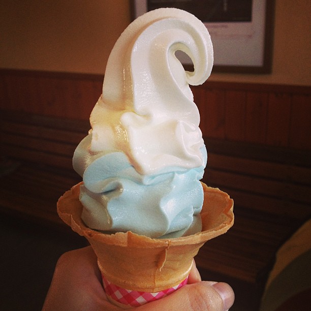 左は富士山ソフトクリーム。下の水色の部分は青薔薇だそうで。さわやかでとってもおいしかった!