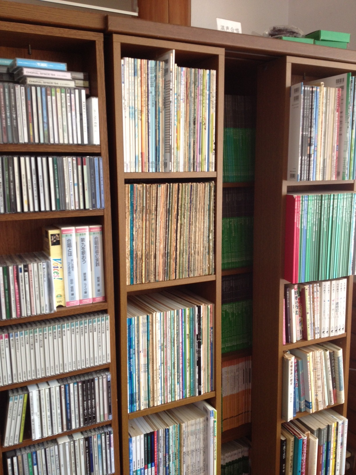 右:本棚の合唱譜の量がはんぱない。さすが合唱の家!
